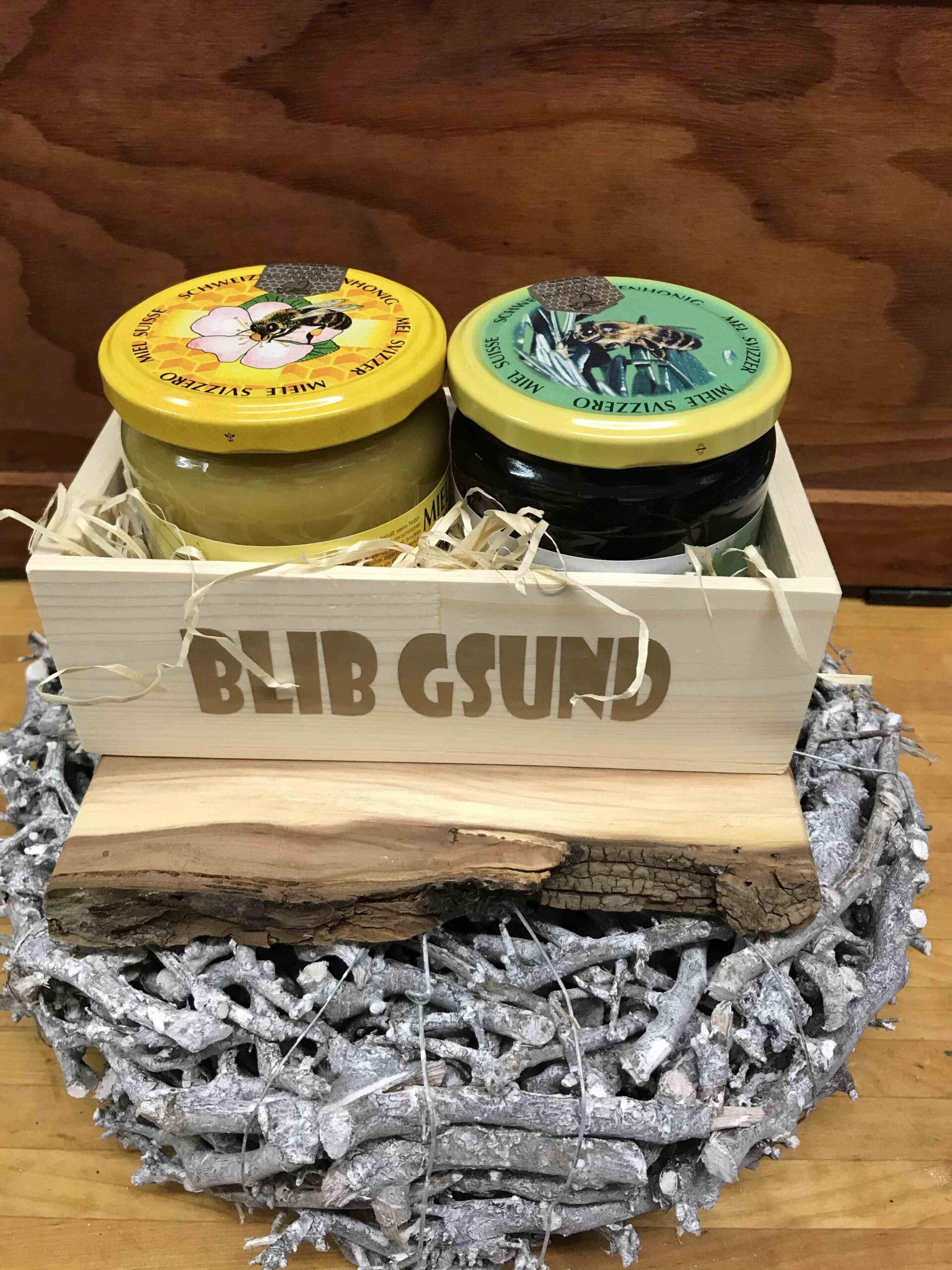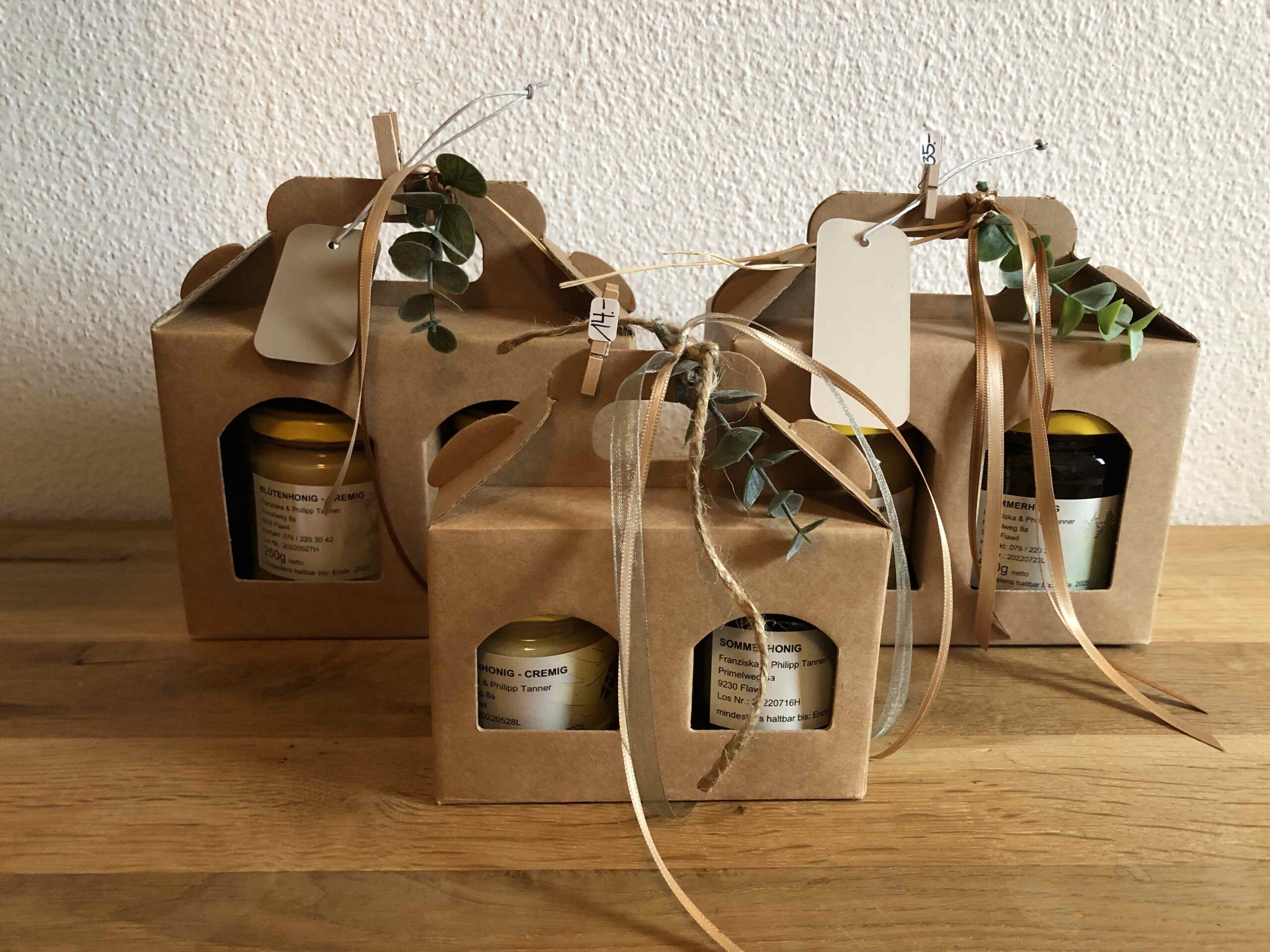 BIENENHONIG NATURPRODUKTE GESCHENKE FREILANDEIER FLORISTIK Bienenhonig Blütenhonig 500g CHF 17.00 Sommerhonig 500g CHF 17.00 Waldhonig 500g CHF 17.00 Unsere Grössen: 125g CHF 5.50250g CHF 9.50500g CHF 17.00 Naturprodukte Lippenbalsam CHF 5.00 Propolissalbe CHF 10.00 Bienenwachstuch Set CHF 12.00 Body Butter5 Herzli CHF 7.50 Body Butter4 Blüemli CHF 7.50 Body Butter1 Gugelhopf CHF 4.50 Honig-Badesalz CHF 9.50 Lavendel-Badesalz CHF 9.50 Rosenblüten-Badesalz CHF 9.50 Geschenke Holzkistli gefüllt 2x 125g CHF 17.002x 250g CHF 27.002x 500g CHF 44.00 Holzkistli beschriftet klein CHF 6.00gross CHF 8.00 Holzkistli individuell Fülle das Holzkistli mit unseren Produkten Kleine Mitbringsel ab CHF 14.00 Lunch Box beschriftet CHF 15.00 Fotokarten CHF 5.00 Freilandeier Wachteleier 6er Karton CHF 3.0012er Karton CHF 6.00 Wachteleischere CHF 5.00 Zwerg-Seidenhünereier 6er Karton CHF 3.00 Floristik Kurse: BadesalzBienenwachs-TücherSaisonelle FloristikAdventsfloristikweitere auf Anfrage Frischblumen Dekoration Trockenmaterial Dekoration Adventsdekoration Bepflanzte Gefässe